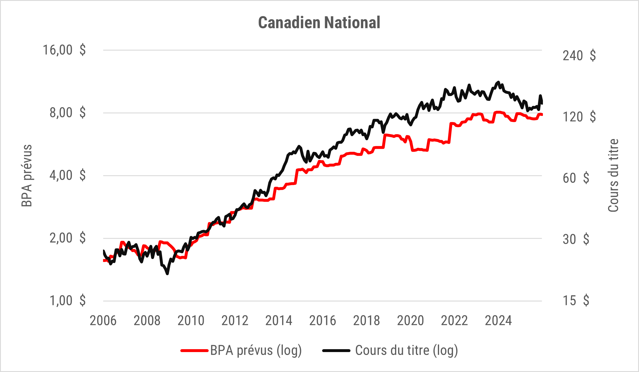 J’en suis convaincu et j’espère que vous l’êtes aussi : à long terme, le cours d’un titre suivra l’évolution de ses BPA. Comme on peut le constater dans certains des graphiques présentés, il existe parfois une déconnexion entre les deux – c’est ce qui peut créer des occasions d’investissement intéressantes.