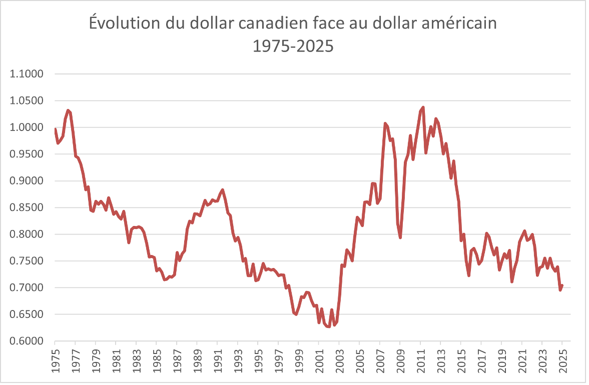 Pour moi, la faiblesse récente de notre devise face au dollar américain reflète en bonne partie les risques et l’incertitude liés à la nomination de M. Trump à la présidence des États-Unis. Depuis que ce dernier a officiellement remporté les élections présidentielles, le 5 novembre 2024, le dollar canadien s’est déprécié de 2,9 %. Depuis la fin de septembre 2024, il a perdu 4,8 %. En particulier, ses menaces de tarifs douaniers exercent une pression à la baisse sur notre devise.